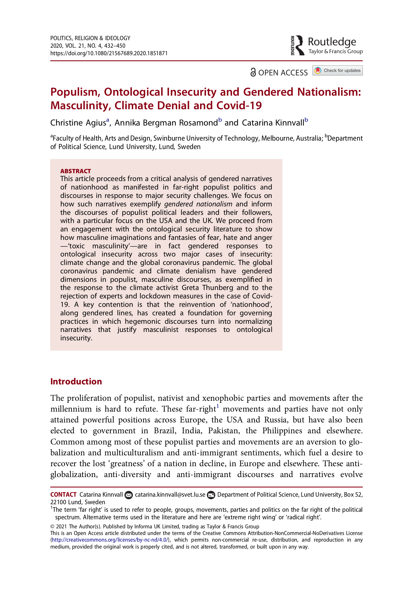 Agius, C., Rosamond, A. B., & Kinnvall, C. (2020). Populism, ontological insecurity and gendered nationalism: Masculinity, climate denial and Covid-19. Politics, Religion & Ideology, 21(4), 432-450.