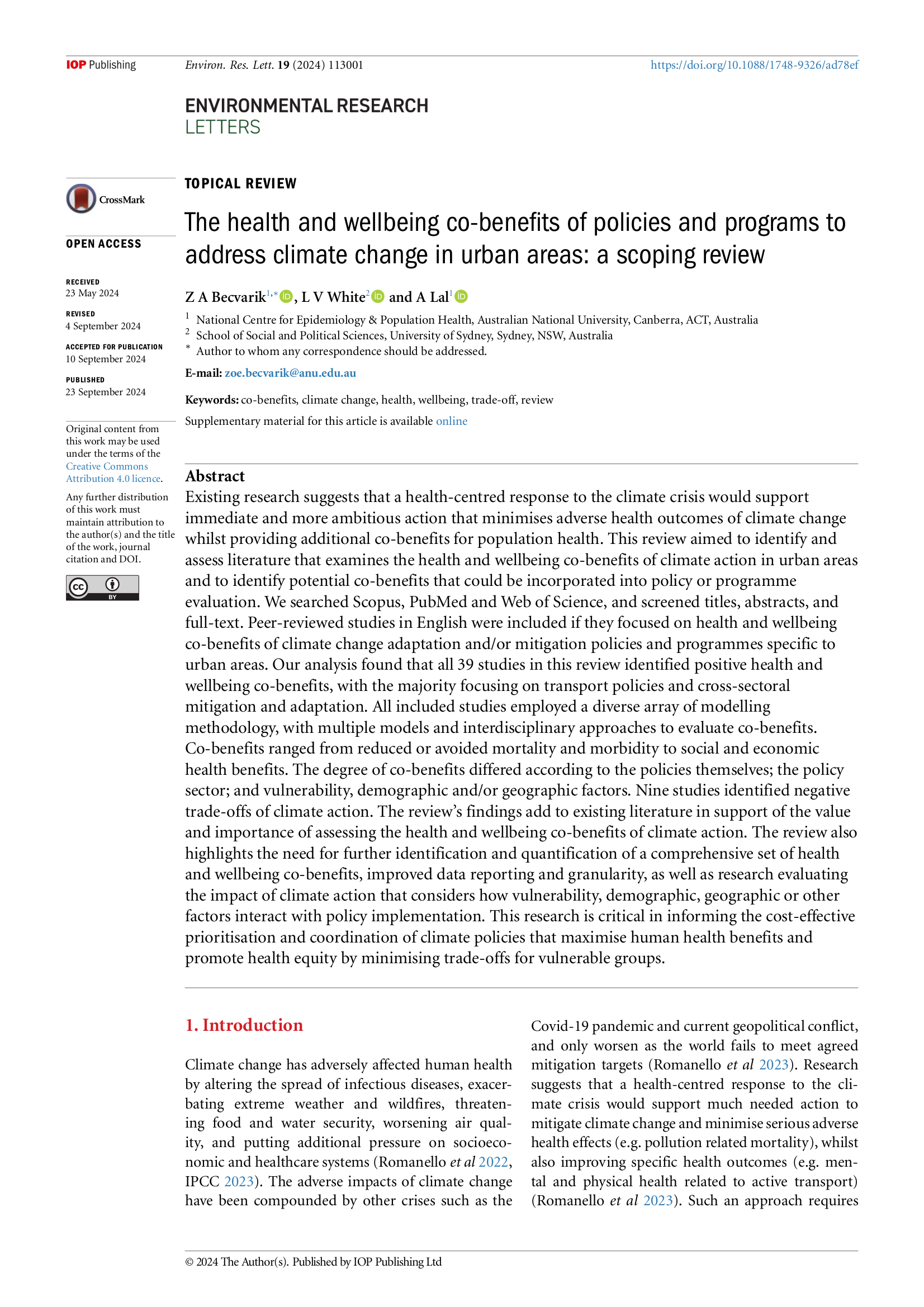 Becvarik, Z. A., & White, L. (2024). The health and wellbeing co-benefits of policies and programs to address climate change in urban areas: A Scoping review. Environmental Research Letters.