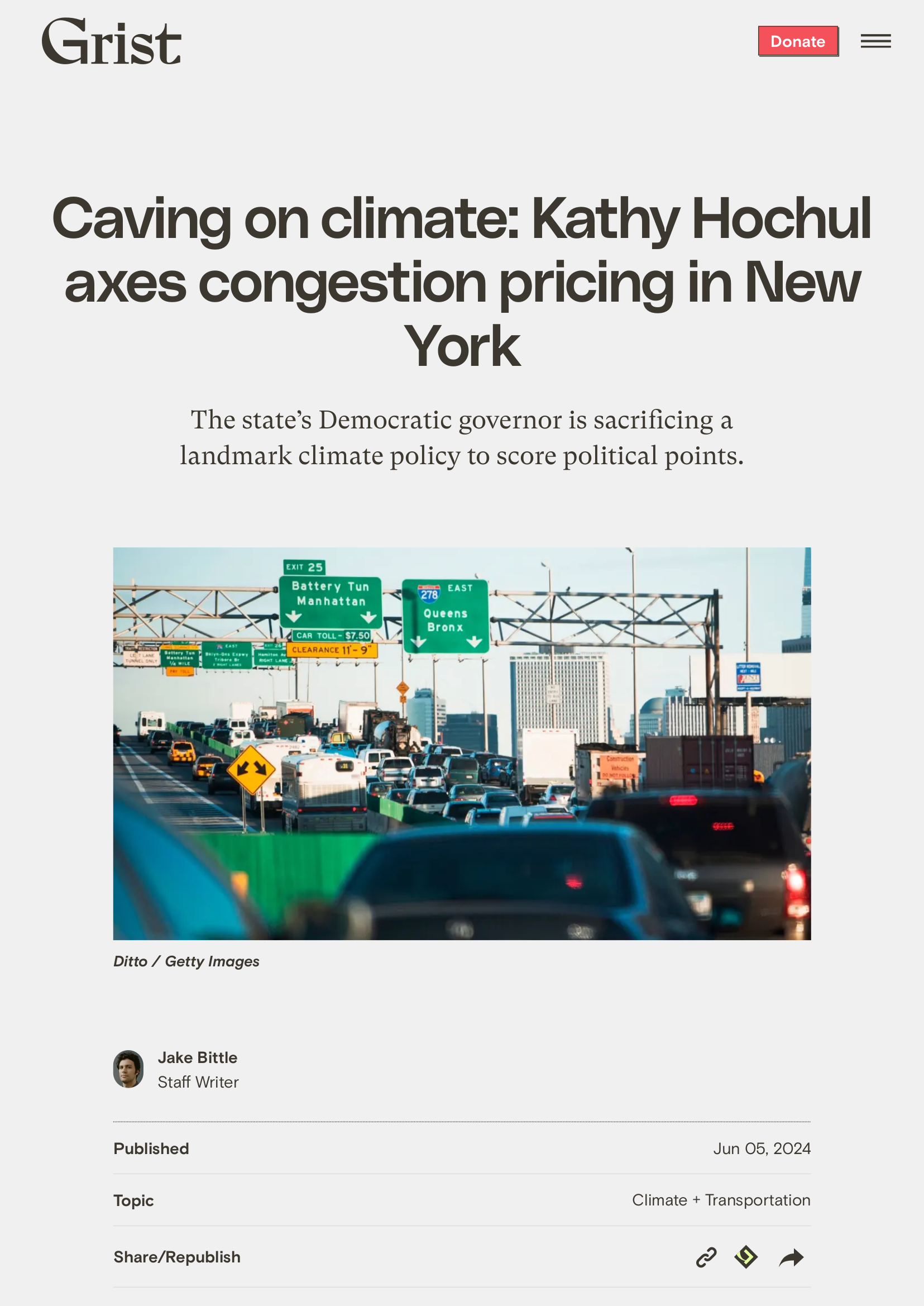 Bittle, J. (2024). Caving on climate: Kathy Hochul axes congestion pricing in New York. Grist. https://grist.org/transportation/kathy-hochul-congestion-pricing-new-york/