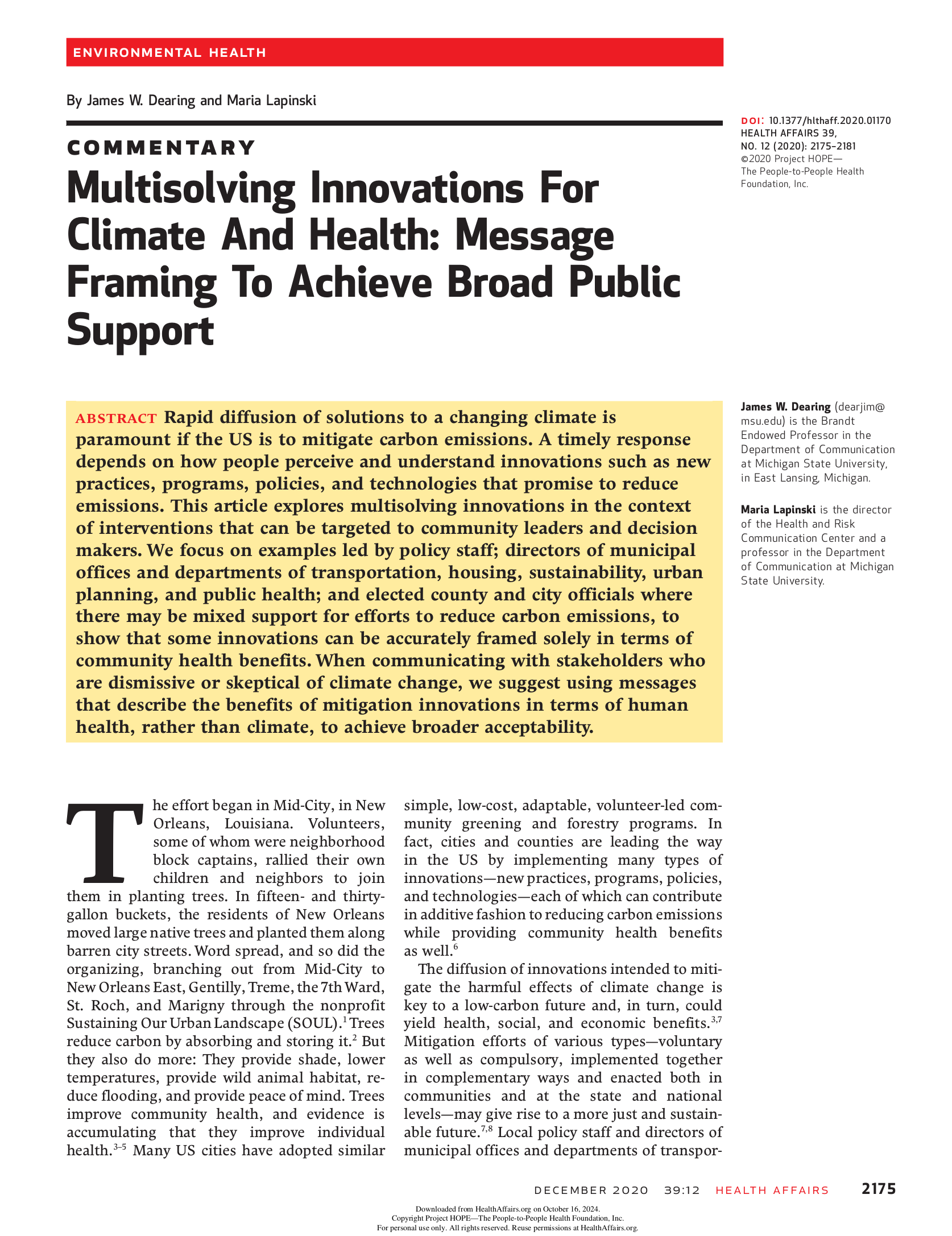 Dearing, J. W., & Lapinski, M. (2020). Multisolving innovations for climate and health: Message framing to achieve broad public support: Article examines innovations for climate and health. Health Affairs, 39(12), 2175-2181.