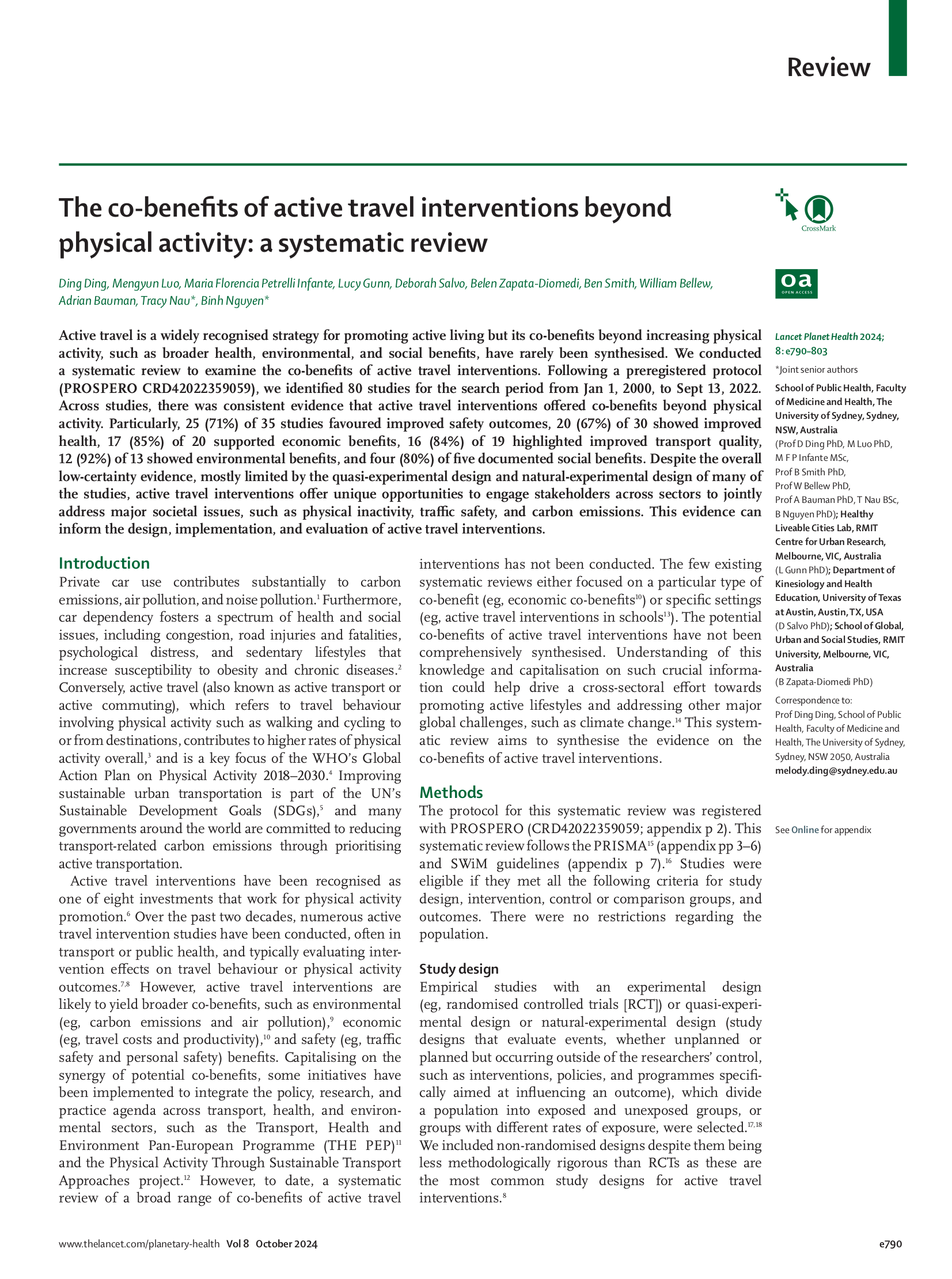 Ding, D., Luo, M., Infante, M. F. P., Gunn, L., Salvo, D., Zapata-Diomedi, B., … & Nguyen, B. (2024). The co-benefits of active travel interventions beyond physical activity: a systematic review. The Lancet Planetary Health, 8(10), e790-e803.