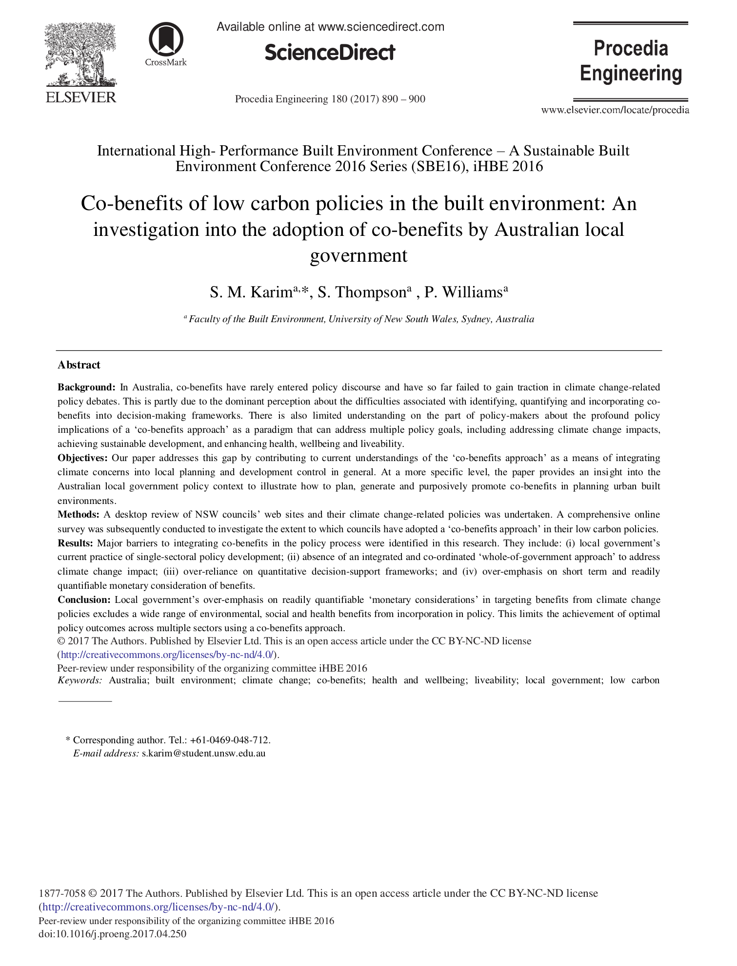 Karim, S. M., Thompson, S., & Williams, P. (2017). Co-benefits of low carbon policies in the built environment: an investigation into the adoption of co-benefits by Australian local government. Procedia engineering, 180, 890-900.