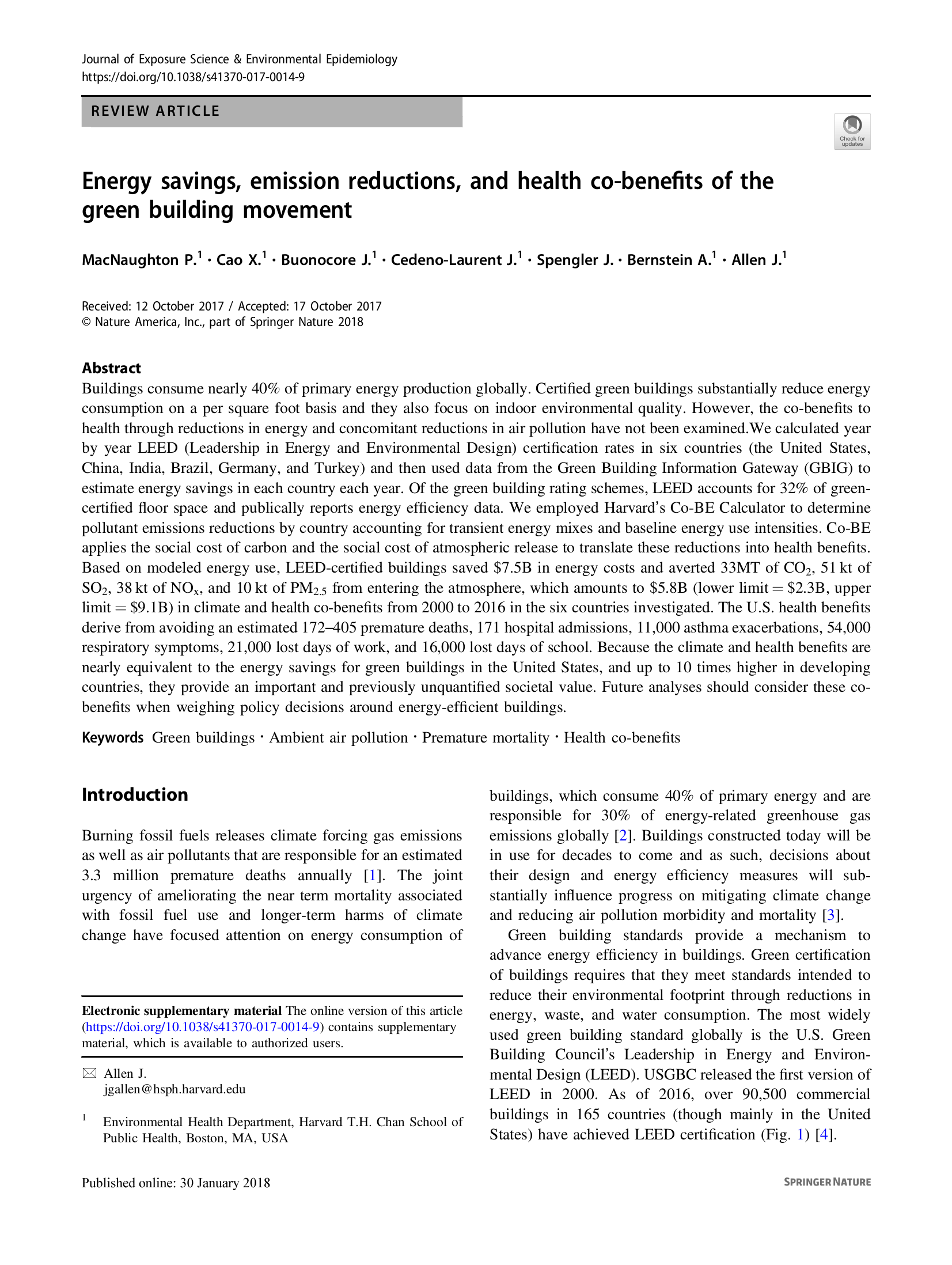 MacNaughton, P., Cao, X., Buonocore, J., Cedeno-Laurent, J., Spengler, J., Bernstein, A., & Allen, J. (2018). Energy savings, emission reductions, and health co-benefits of the green building movement. J. Expo. Sci. Environ. Epidemiol, 28(4), 307-318.