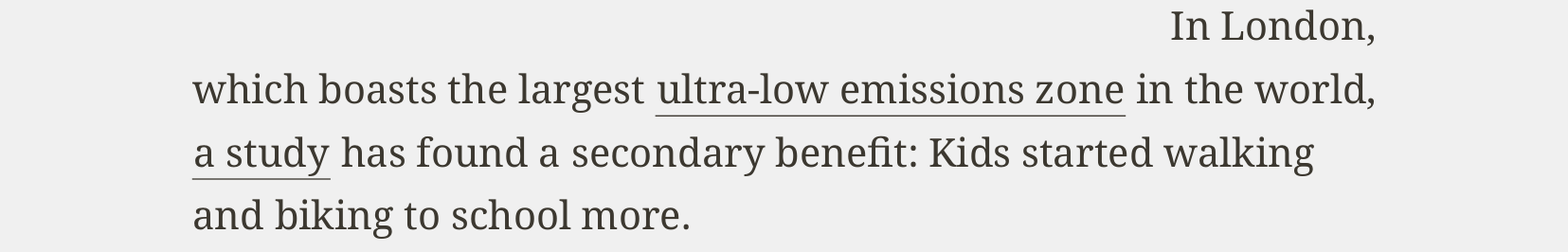 Valentine, S. (2024). London saw a surprising benefit to fining high-polluting cars: More active kids. Grist. https://grist.org/cities/london-fining-polluting-cars-more-active-kids/
