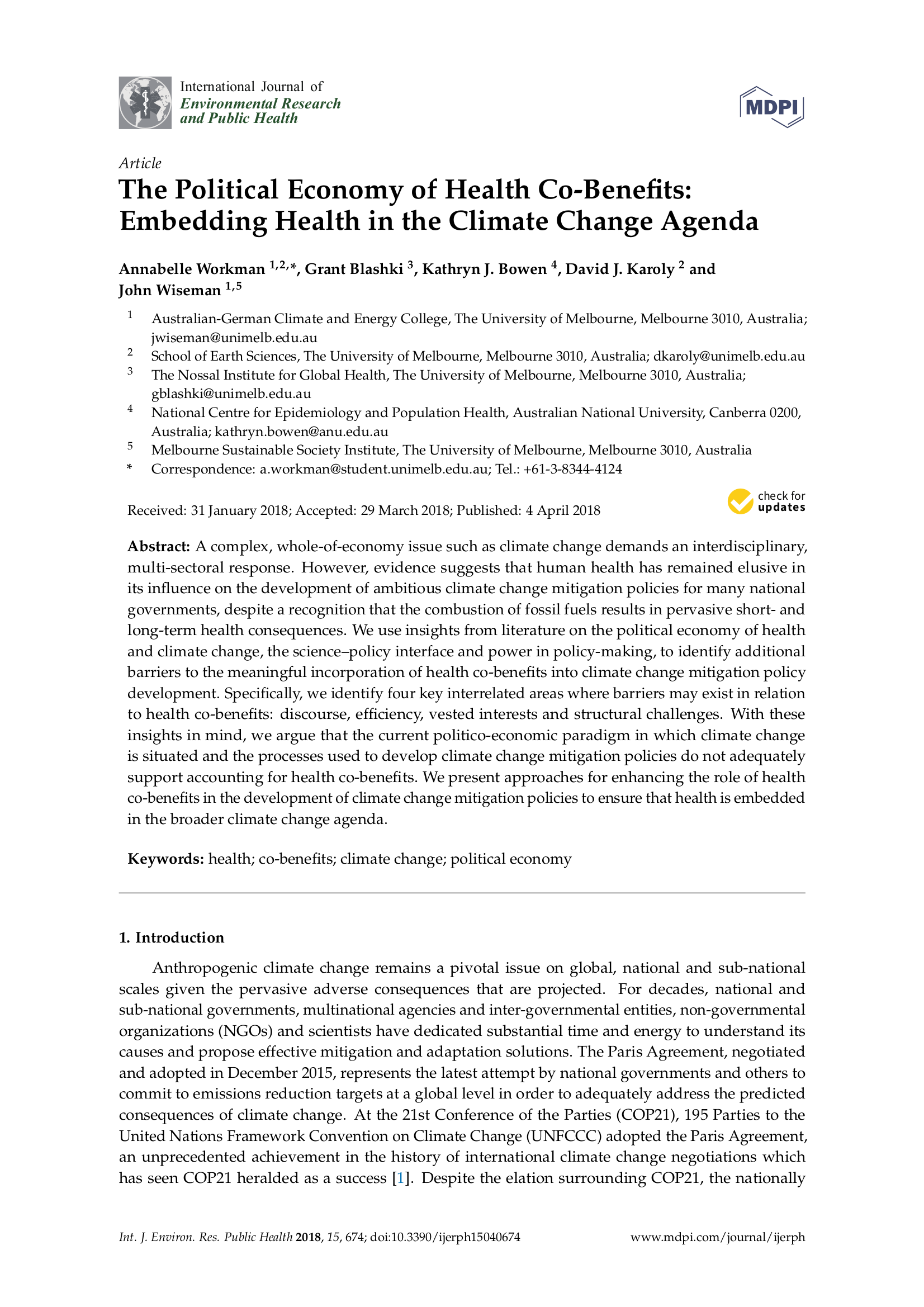 Workman, A., Blashki, G., Bowen, K. J., Karoly, D. J., & Wiseman, J. (2018). The political economy of health co-benefits: embedding health in the climate change agenda. International journal of environmental research and public health, 15(4), 674.