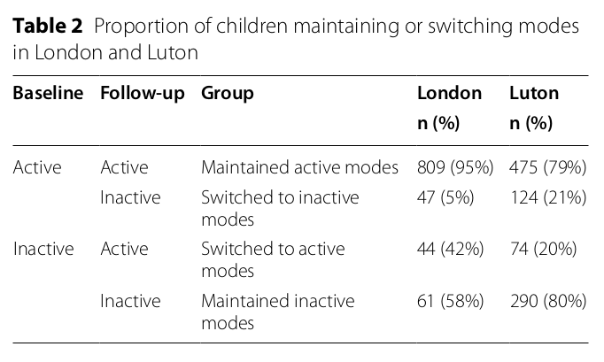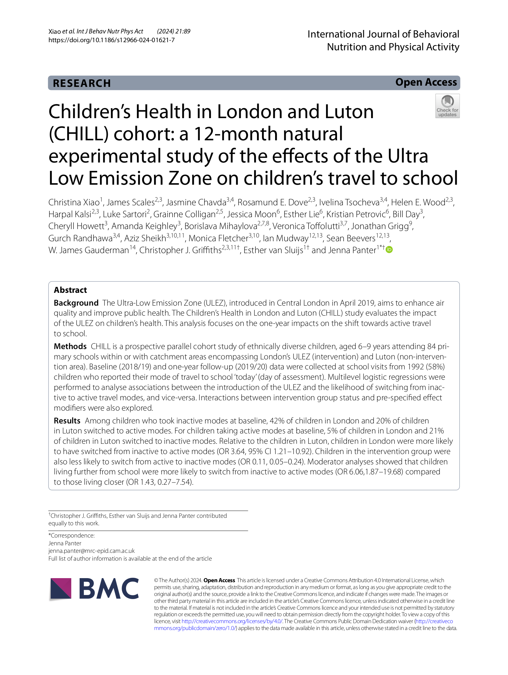 Xiao, C., Scales, J., Chavda, J., Dove, R. E., Tsocheva, I., Wood, H. E., … & Panter, J. (2024). Children's Health in London and Luton (CHILL) cohort: a 12-month natural experimental study of the effects of the Ultra Low Emission Zone on children's travel to school. International Journal of Behavioral Nutrition and Physical Activity, 21(1), 89.>